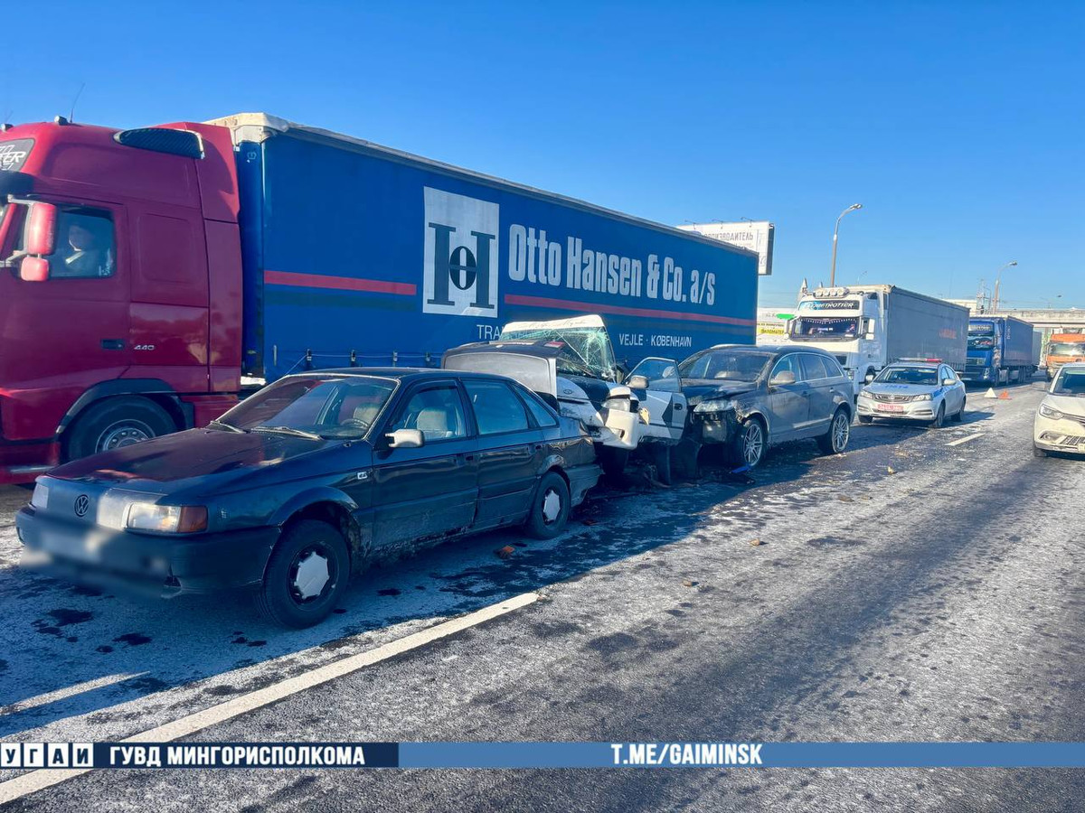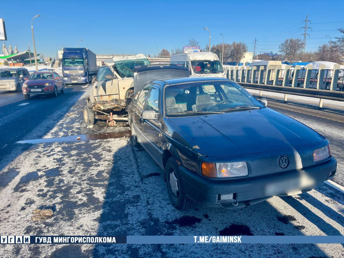 The Minsk State Traffic Inspectorate reported an accident that occurred today at around 3:20 PM near the 11th kilometer of the inner ring of the Moscow Ring Road. A 67-year-old Audi driver collided with a parked Volkswagen with a partial load trailer on which a Hyundai was located.